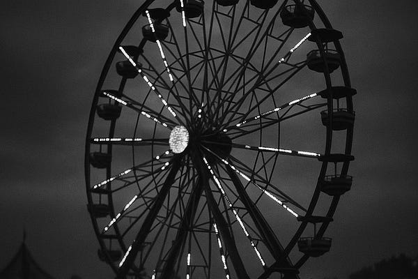 The Ferris wheel spins on its own, carrying the lost too high to come down.